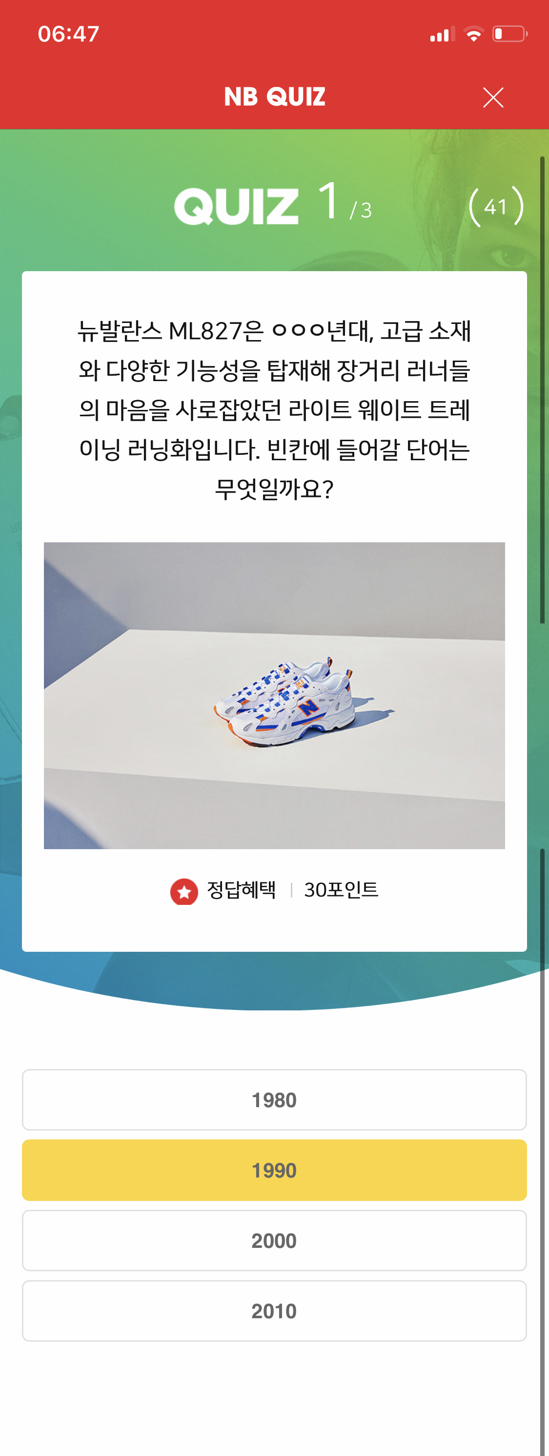뉴발란스 ML827은 OOO년대, 고급 소재와 다양한 기능성을 탑재해 장거리 러너들의 마음을 사로잡았던 라이트 웨이트 트레이닝 러닝화입니다. 빈칸에 들어갈 단어는 무엇일까요?