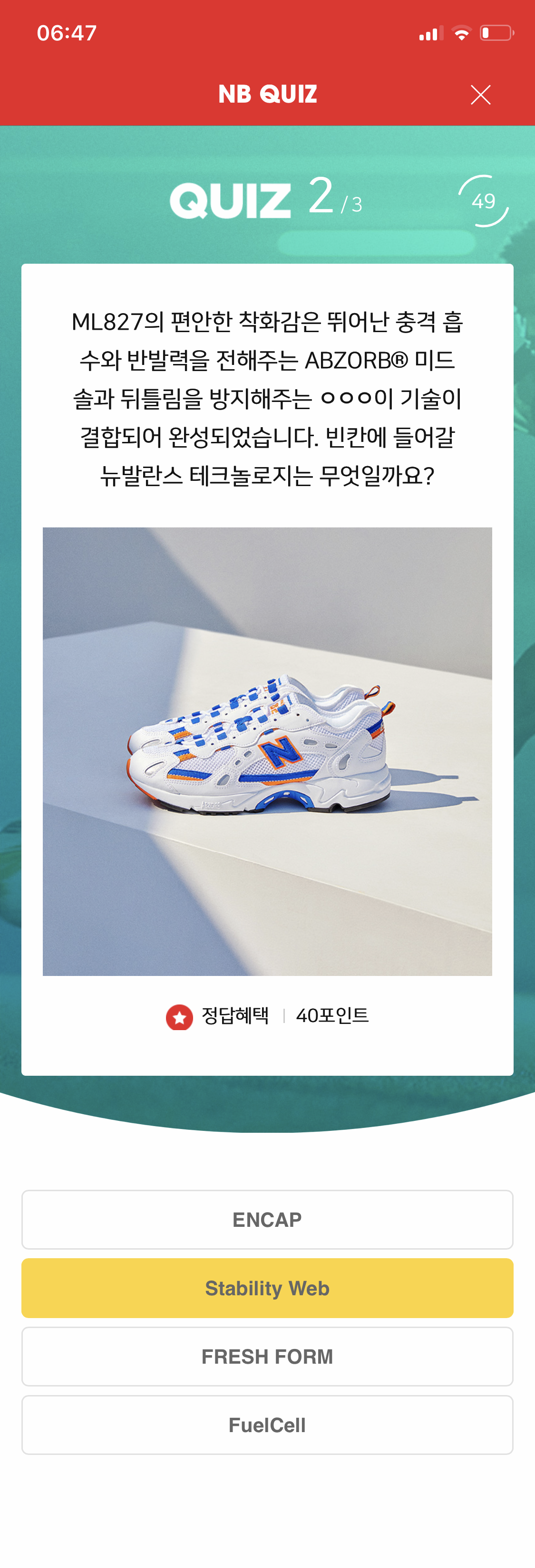 ML827의 편안한 착화감은 뛰어난 충격 흡수와 반발력을 전해주는 ABZORB 미드솔과 뒤틀림을 방지해주는 OOO이 기술이 결합되어 안성되었습니다. 빈칸에 들어갈 뉴발란스 테크놀로지는 무엇일까요?